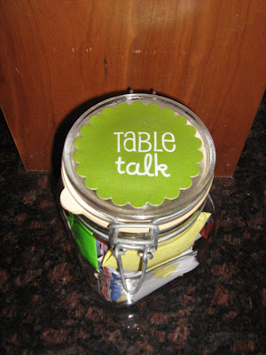 As a final touch, I cut out a scalloped circle and used rub-on letters to spell “Table Talk” and then adhered it to the top of my jar and sealed it with Mod Podge.