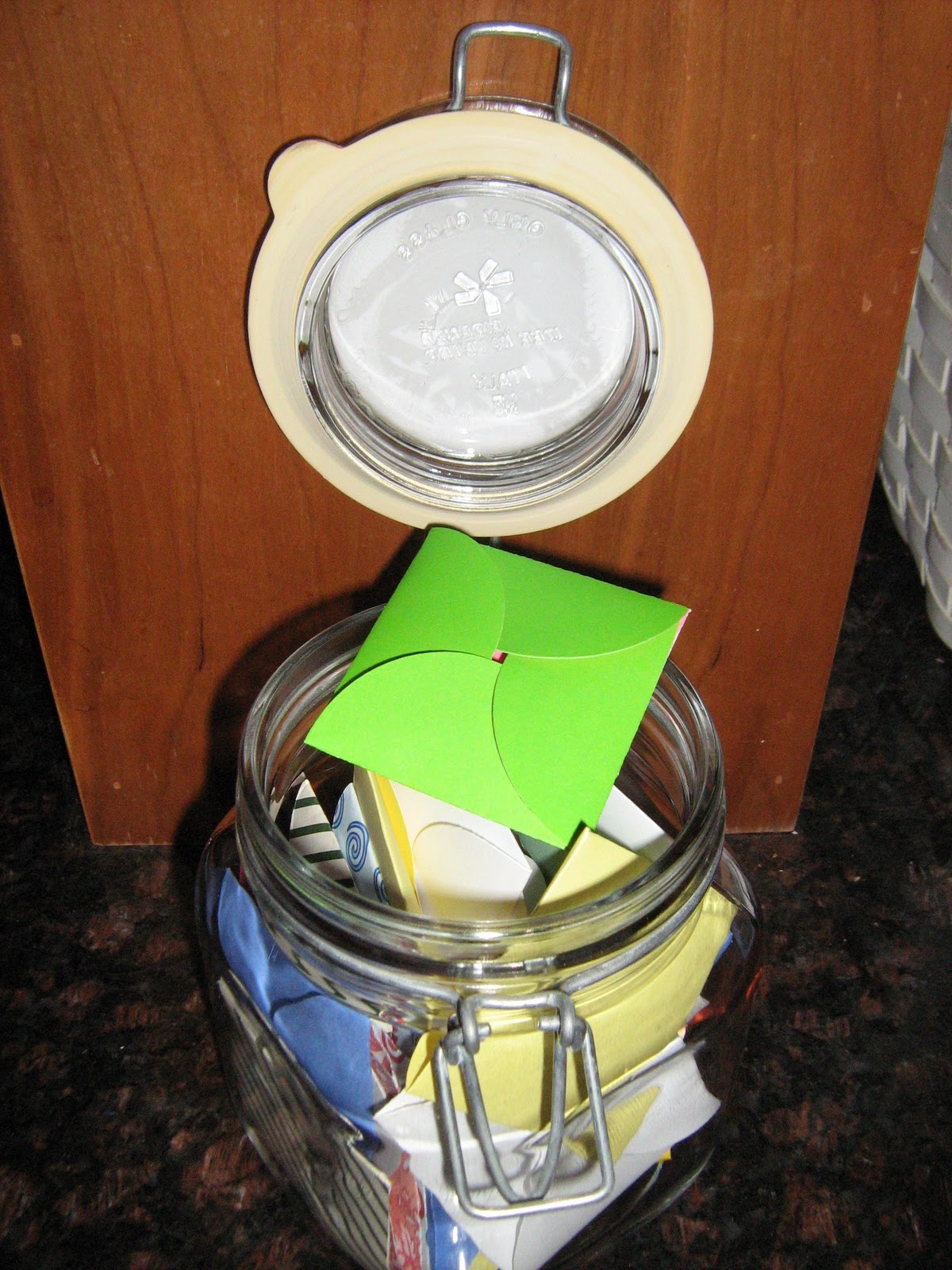 After your questions are written, you simply need a vessel to store your questions until you play the game. I used a wide-mouth glass storage jar that I happened to have. A regular wide-mouth canning jar would work fine. You just need to make sure that someone can reach their hand through the opening to grab a question!